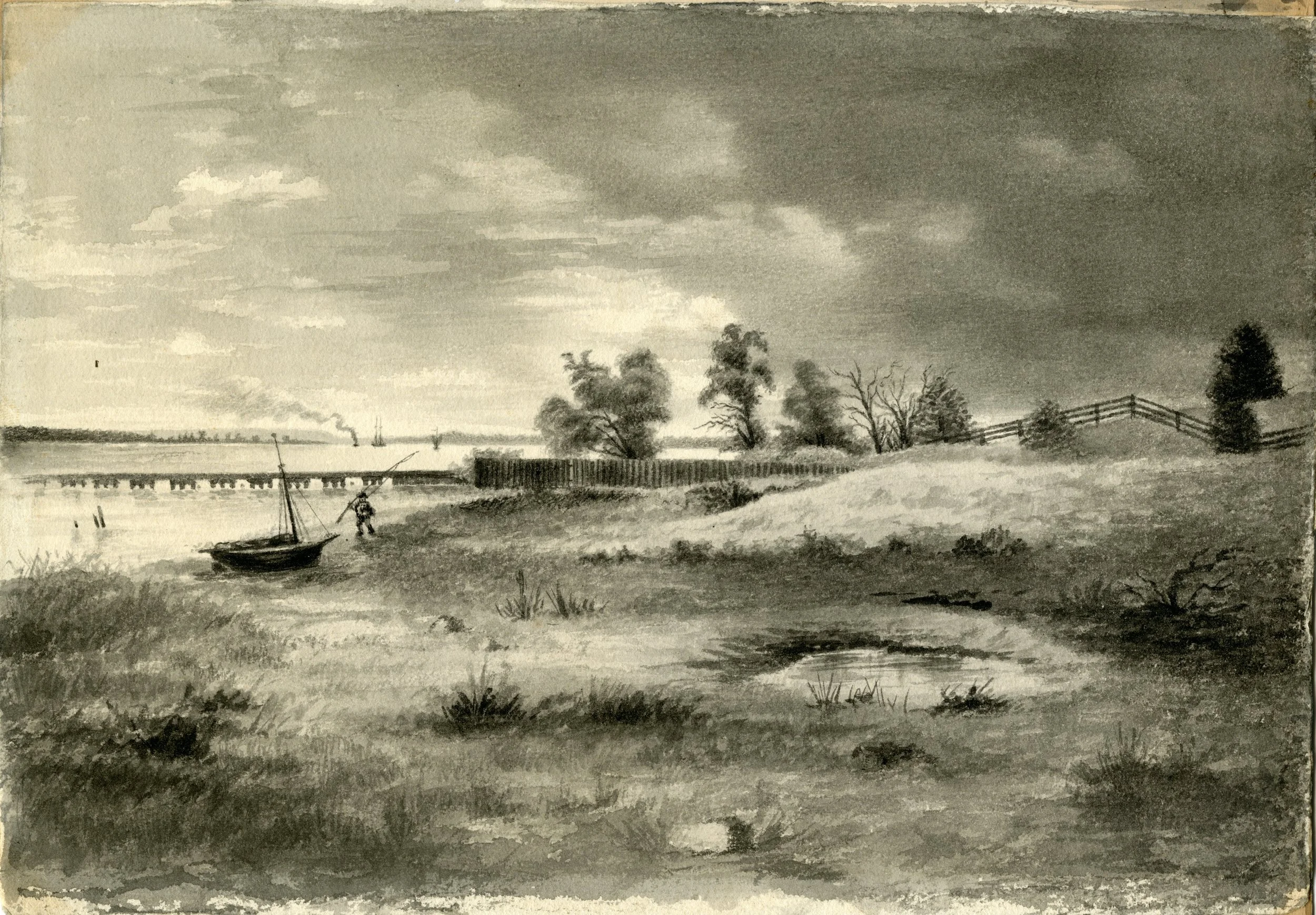 Etching of the southeast corner of Fort Wayne and Dock, Detroit, Mich., August 31st, 1884. Canada’s shoreline is visible in the background. (Detroit Historical Society).