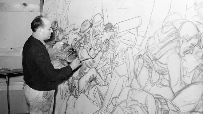 WPA artist Joe Sparks paints soldiers on mural at Fort Wayne in Detroit in 1938. (Detroit News Archive).